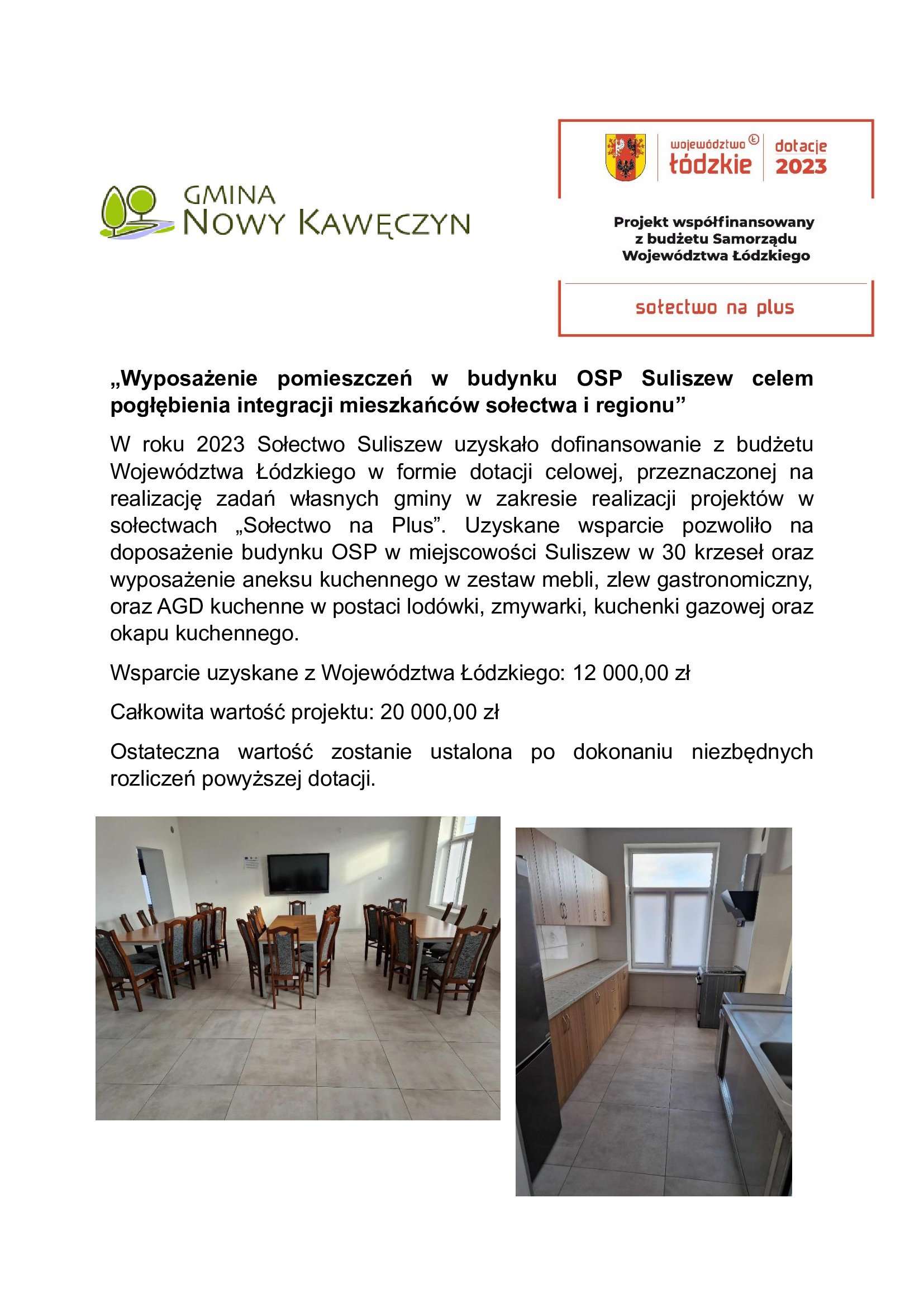 „Wyposażenie pomieszczeń w budynku OSP Suliszew celem pogłębienia integracji mieszkańców sołectwa i regionu”