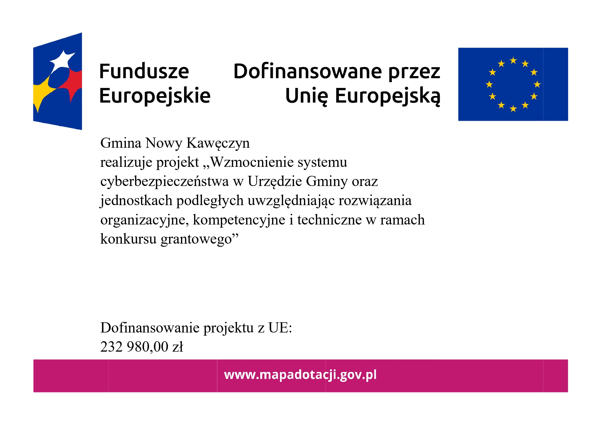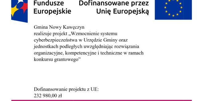 Gmina Nowy Kawęczyn otrzymała 277 356,00 złotych dofinansowania w ramach konkursu grantowego „Cyberbezpieczny Samorząd” z programu FERC, Priorytet II Zaawansowane usługi cyfrowe, Działanie 2.2. Wzmocnienie krajowego systemu cyberbezpieczeństwa, nabór: FERC.02.02-CS.01-001/23, tytuł projektu: Wzmocnienie systemu cyberbezpieczeństwa w Urzędzie Gminy oraz jednostkach podległych uwzględniając rozwiązania organizacyjne, kompetencyjne i techniczne w ramach konkursu grantowego. Dofinansowanie zostanie przeznaczone na podniesienie poziomu cyberbezpieczeństwa w Urzędzie Gminy Nowy Kawęczyn, Gminnym Ośrodku Pomocy Społecznej w Nowym Kawęczynie, Gminnym Zespole do Spraw Oświaty,  Szkole Podstawowej im. Armii Krajowej w Trzciannie i Szkole Podstawowej im. J.A.Grabowskiego w Nowym Dworze, Szkole Podstawowej im. J.Wybickiego w Strzybodze.