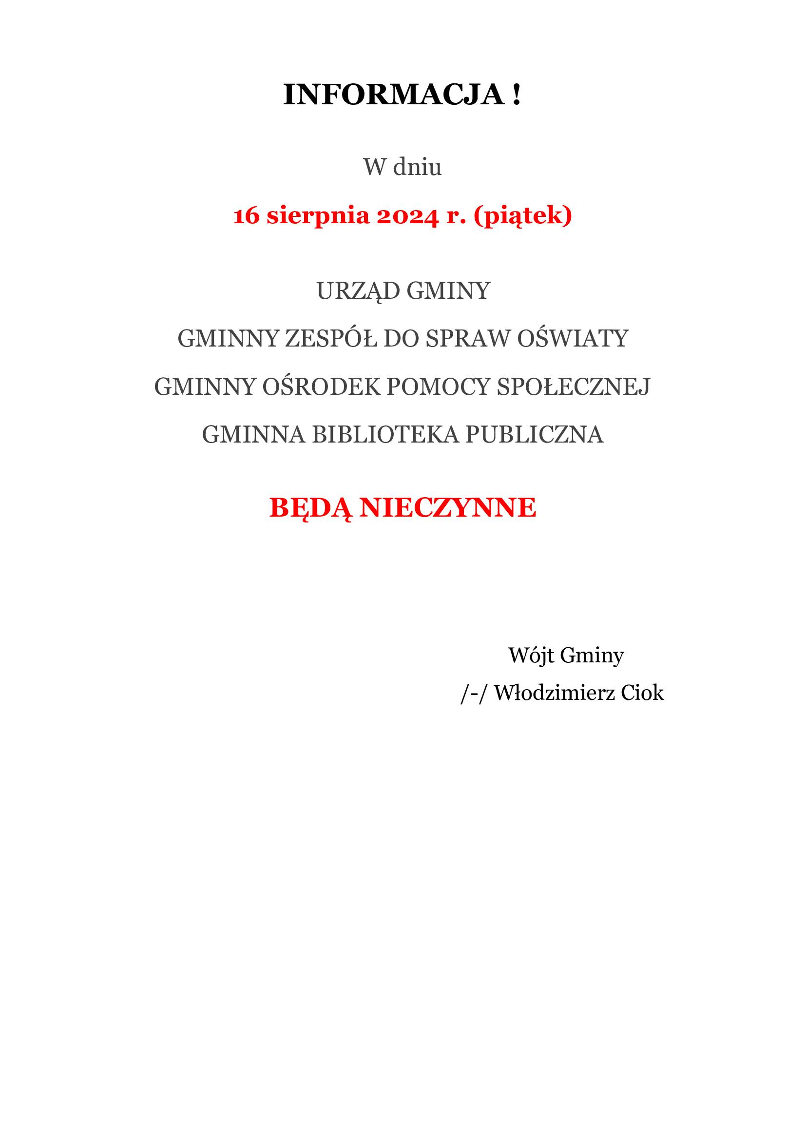 Informacja- praca Urzędu w dniu 16.08.2024 r.